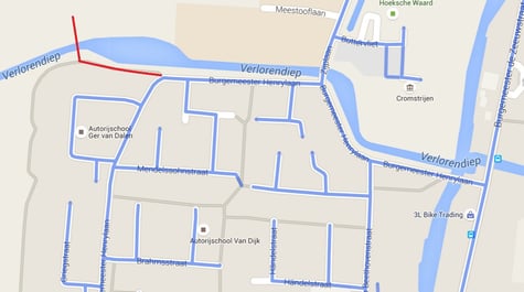 De trainingslocatie bevindt zich in Numansdorp. Op het onderstaande kaartje loopt een grijze lijn (verlengde van de burgemeester Henrylaan langs het Verloren Diep) Dit is een wandelpad en de rode lijn geeft de route aan naar de trainingslocatie. Je gaat hierbij via een bruggetje over het Verloren Diep en via een poort kom je op de trainingslocatie.